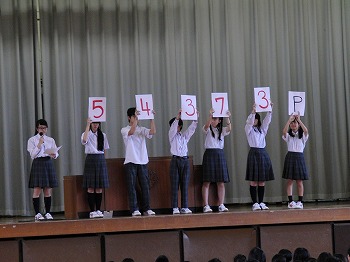 式の後に、生徒会より、あいさつ運動「50000続キャンペーン」の結果発表がありました。10日間で「いいあいさつ」に対して発行されたあいさつ券はなんと54373枚。夏休み明けから飲料の自動販売機に、希望の多かった飲み物が追加されます。