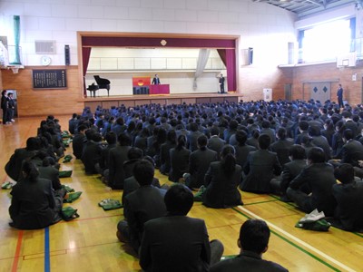 とても寒い体育館での終業式。生徒たちはそんな中でもきちんと前を向いて話を聞いていました。校長先生からは。「一年の計は元旦にあり」元旦は1月1日の朝、年の初めに目標を立てるのが大切だという話をはじめとした日本のお正月のお話を頂きました。