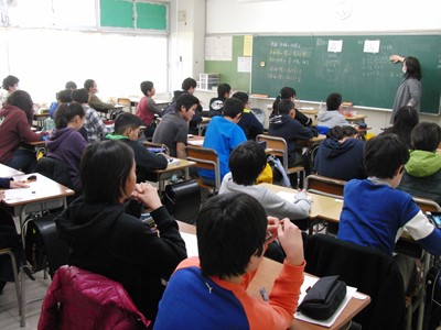 西寺尾小学校と西寺尾第二小学校の6年生児童が、中学校の授業を体験しに来ました。ちょっと大きめの机で、真剣に、楽しく授業を受けていました。