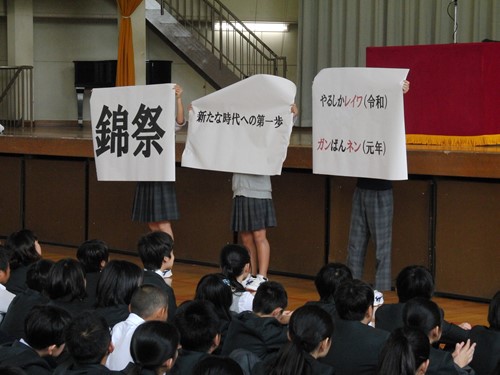 今年の体育祭は6月に開催します。それに伴って、体育祭のスローガンが発表されました。「錦祭~新たな時代への第一歩 やるしかレイワ(令和)ガンばんネン(元年)」です。生徒たち、さすがです。きっちり「令和元年」を突っ込んできました。