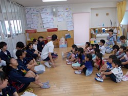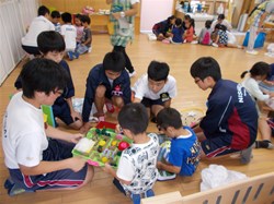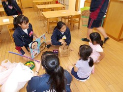 3年生の家庭科の授業で保育実習が行われました。近隣の保育園に、この日のために授業の中で作った手作りのおもちゃを持参し、園児たちと楽しく過ごしました。