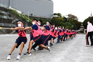 クラス対抗リレーや綱引きでもマスク姿の生徒が多く、予防意識の高さを感じました。力を合わせて全力で取り組み、素晴らしい学年体育祭となりました。