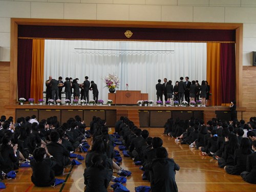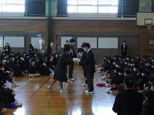 次に、対面式です。初めて全校生徒が一堂に会します。2・3年生と1年生の代表生徒のあいさつがあり、2・3年生が校歌を斉唱し、生徒会から記念品の贈呈が行われました。