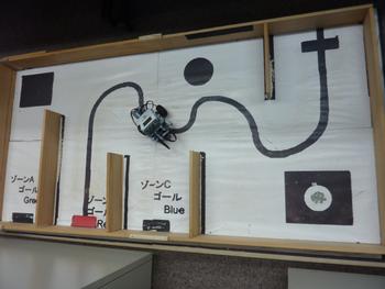 放課後のPC教室。何やらPC部の生徒が作業に励んでいます。三年生に聞いてみると、今夏のWROコンテストに向けての準備をしているとのこと。このコンテストは、車輪付ロボットにプログラミングを施し、決められたコースをどれだけ速くゴールするかで勝敗を決する大会だそうです。