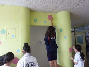 今日は、一日をかけて南棟4階(二年生トイレ)のウォールアートを行いました。暑い中、部員一同協力して頑張りました。『ペインティングに際し、水加減がちょっと難しかったですが、うまくできました!』と部員一同、ご満悦でした!壁がとても明るくなり、楽しい雰囲気が漂っています。午前・午後、総勢15名の美術部部員が頑張りました!
