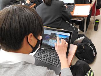 令和3年度より一人一台PCが配付されて、授業や学校の活動に本格的に活用が始まりますが、それに先立ち本日2年生の一部のクラスで初めて電源を入れて試用してみました!まずは校外学習の事前調べ学習です。